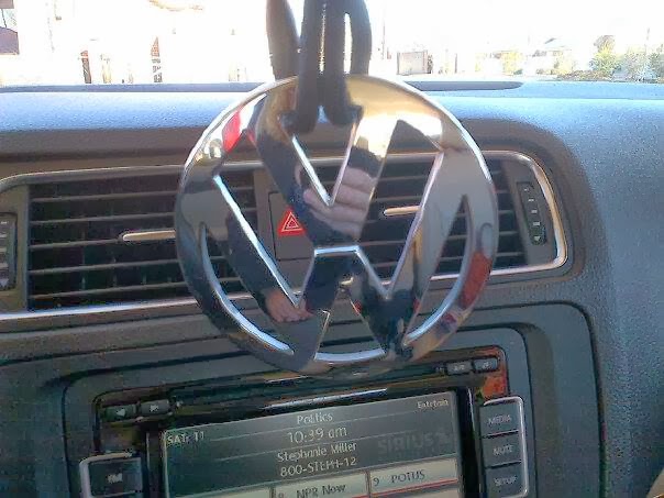 to remember her by and all the good time I had with her. As I was leaving the wrecking yard I pried off the VW emblem off the trunk. I hung it from the rear view mirror today of her replacement. I got a 2011 red Jetta with the exact same package as the last one and it too has the same diesel engine. I am